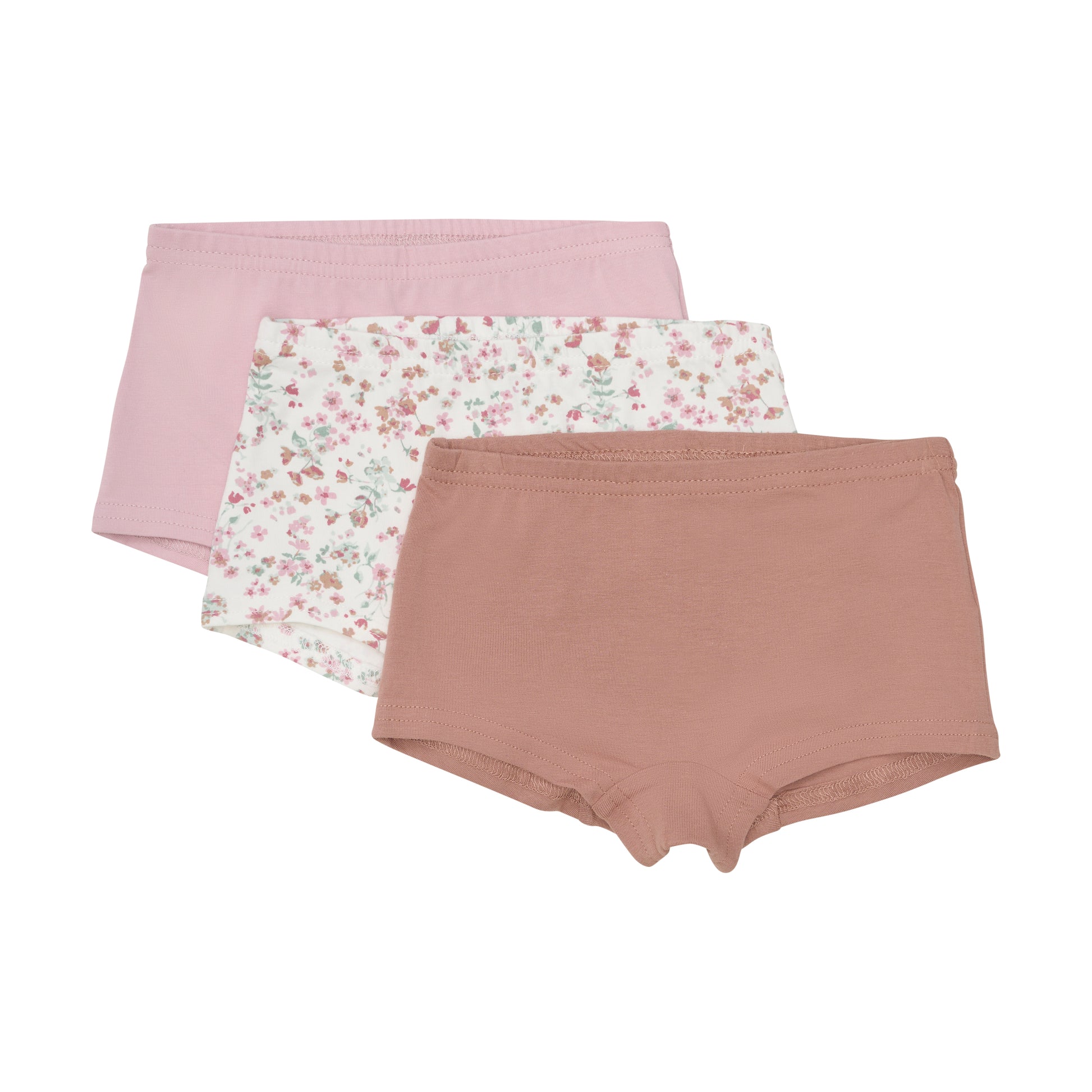 Næbuxurnar eru seldar 3 saman í pakka og eru tvær einlitaðar og eitt par með blómamunstri