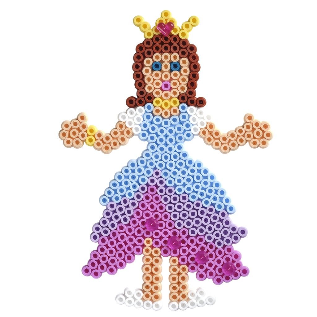 2.000 perlur, 1 prinsessuperluplata nr. 258, 1 Hama steinn, litprentað mynsturblað, leiðbeiningar og straupappír.
