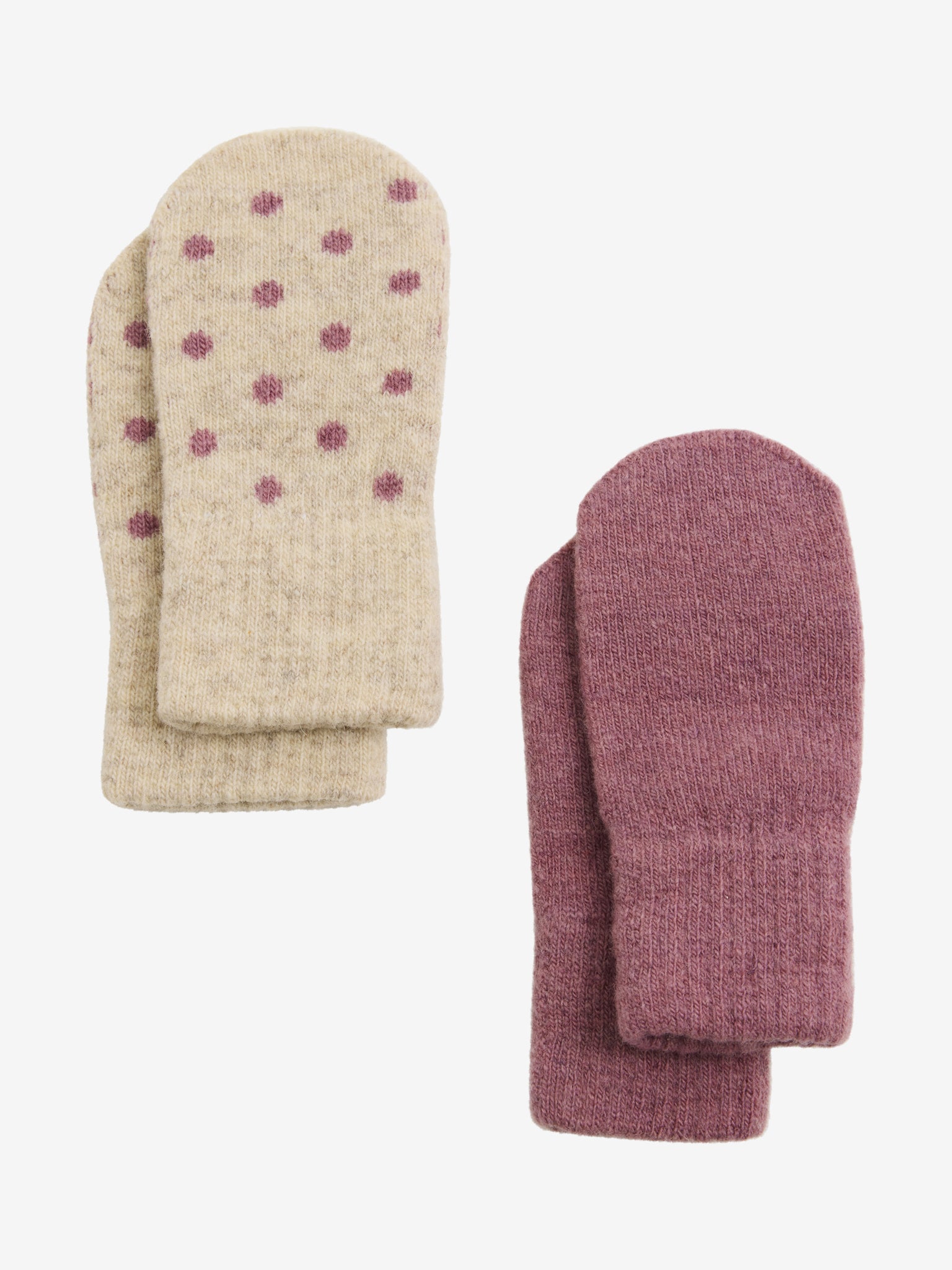 Fallegir vettlingar frá merkinu Celavi. Tvö pör af þumlalausum vettlingum, mjúkir og hlýr fyrir litlar hendur. Annað parið er einlitt í litnum Nostalgia rose og hitt er ljóst með doppum. Vettlingarnir henta börnum frá 0-12 mánaða